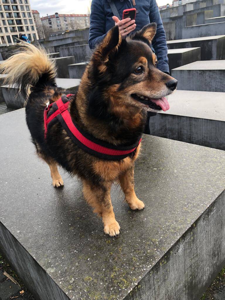 Am nächsten Tag sind wir viel unterwegs. Auf dem Weg zum Potsdamer Platz kommen wir an der jüdischen Gedenkstätte vorbei. Dort bekomme ich sofort einen Platzverweis, Hunde seien dort verboten, diese würden die Stehlen vollkoten und die Gedenkstätte nicht respektvoll behandeln. Von wegen! Ich als Hund weiß dies alles mehr zu respektieren als die vielen Menschen, die dort ihren Müll hinterlassen und ihr Essen auf den Stehlen zu sich nehmen. Das ist nun wirklich nicht schön. Ich hätte diese Aufsichtsperson am Liebsten ordentlich gezwickt, aber ich bin ja ein freundlicher Hund und so lass ich es sein.