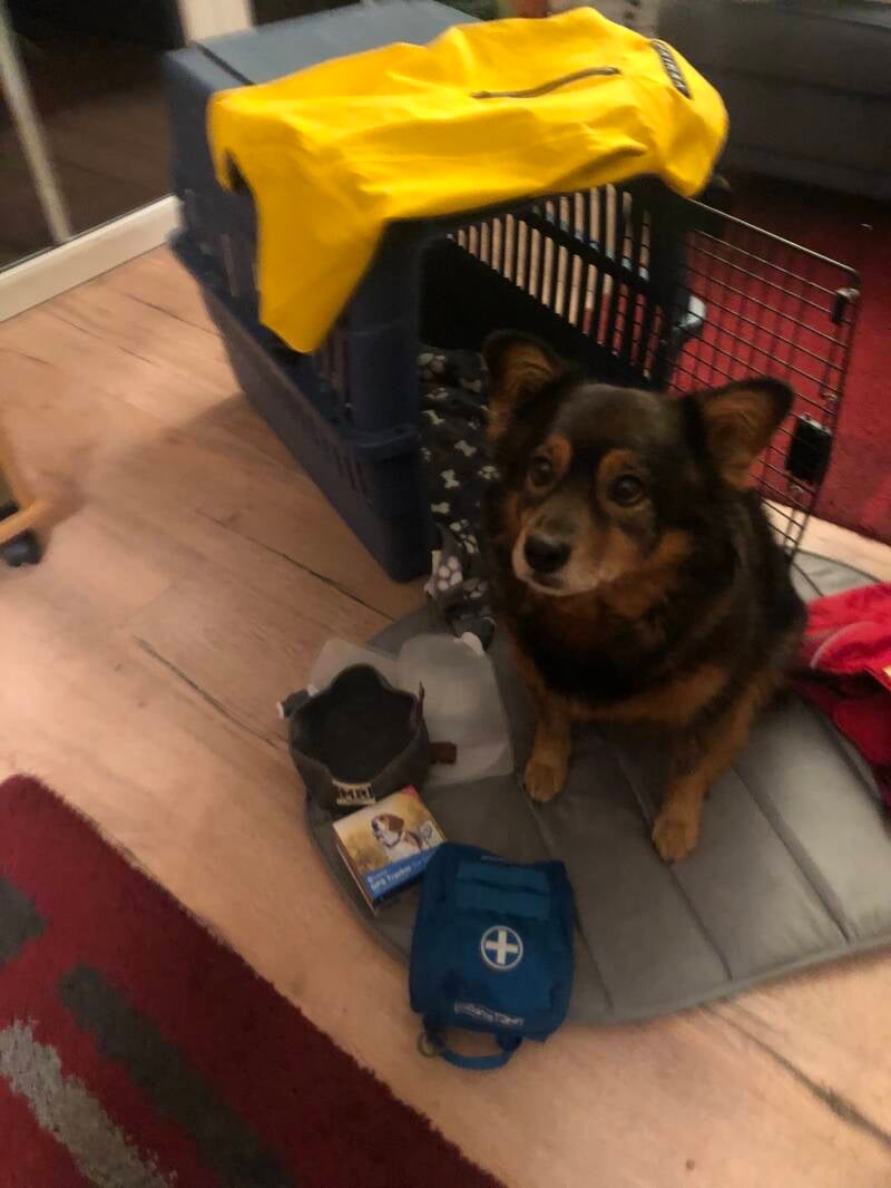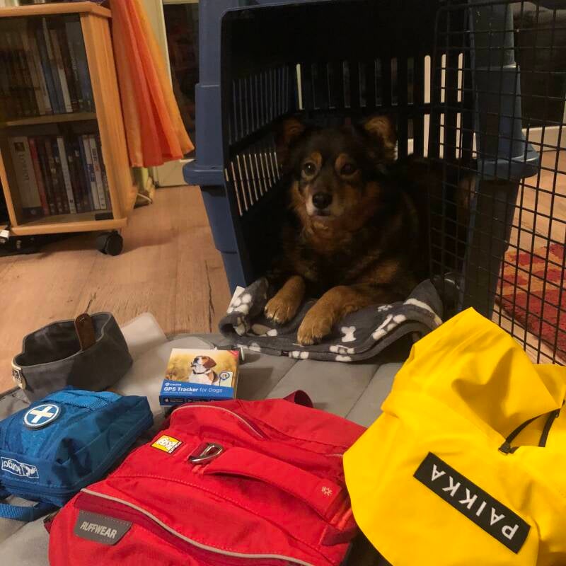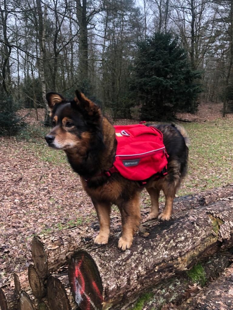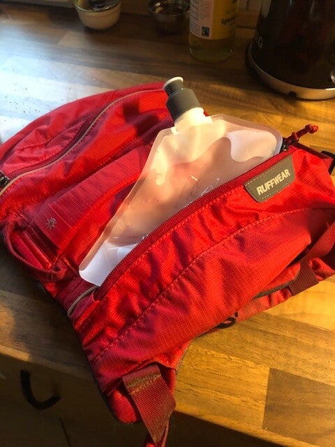 Als wenn der Rucksack allein schon blöd ist, befüllt mein Lieblingsmensch doch tatsächlich die Taschen . Ich soll mein Wasser und Futter auf dem Trail selber tragen!