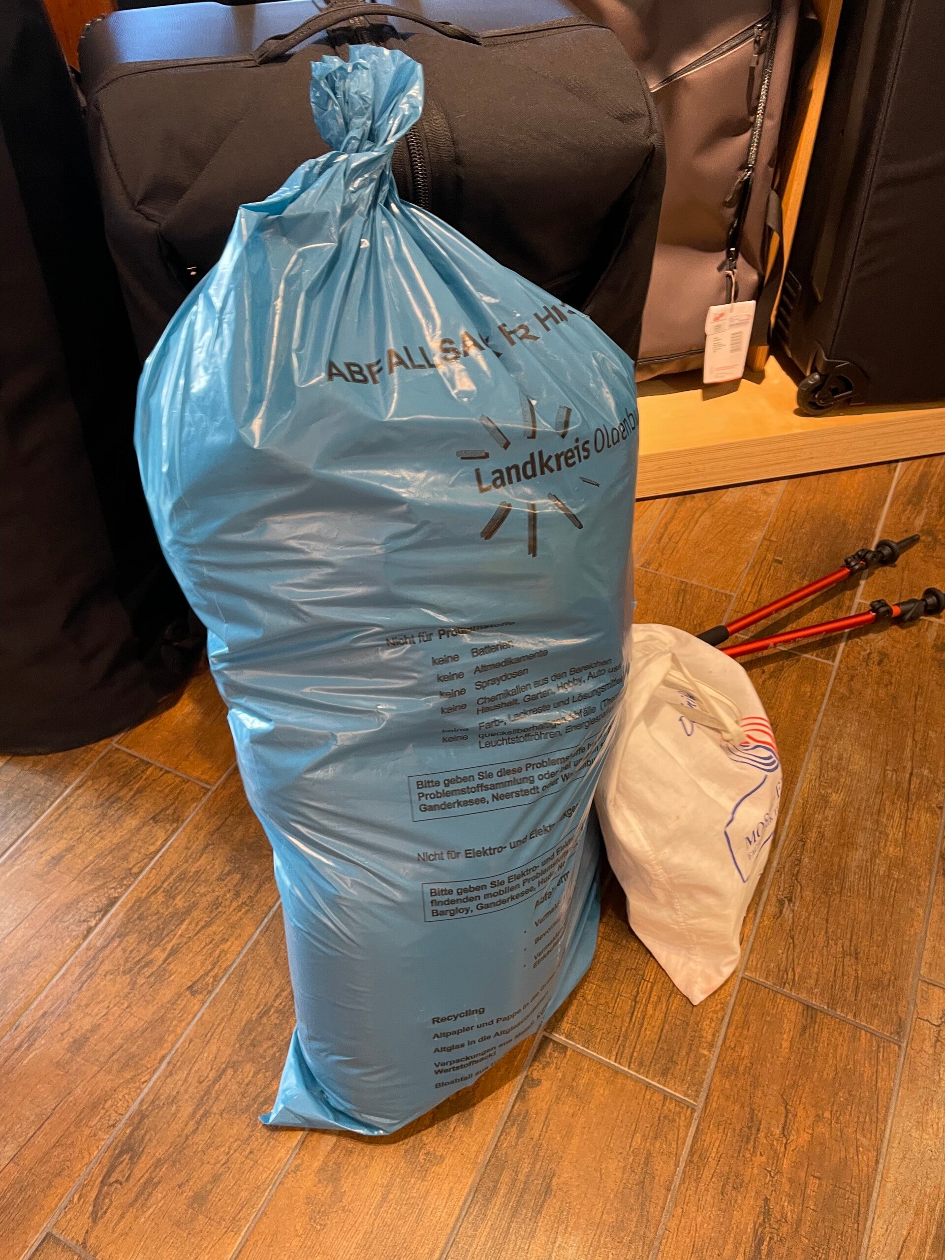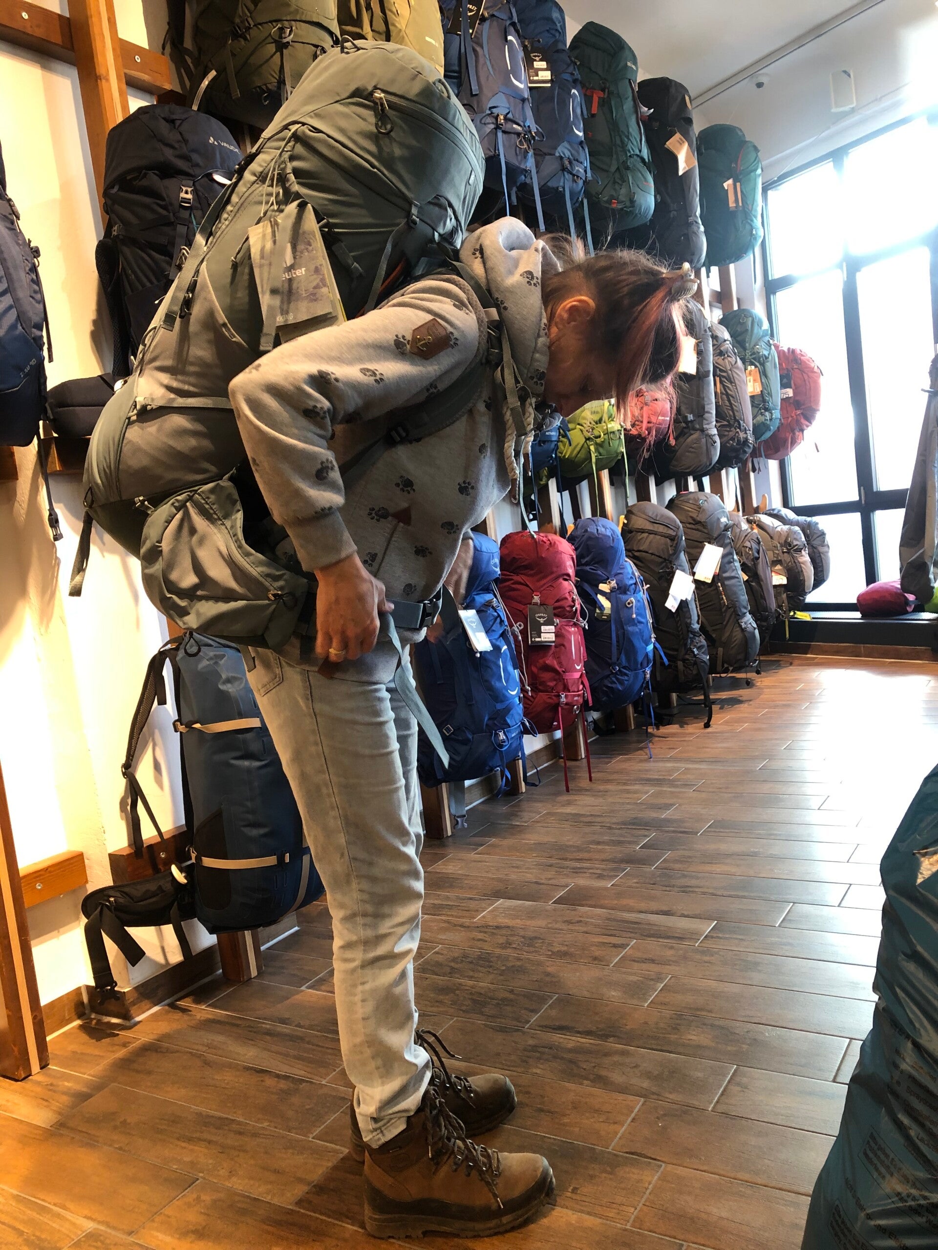 Wir sind also wieder in das Geschäft, was ich schon beim letzten Mal kennengelernt hatte, um dort den Rucksack für unsere Reise zu besorgen. Mit dabei hatte mein Lieblingsmensch einen großen Sack mit all den Dingen, die sich in den Wochen zuvor schon bei uns zu Hause angesammelt hatten. Ich habe nicht so recht verstanden warum das alles mitgeschleppt wird, aber angeblich braucht man das, um die Größe des Rucksackes zu ermitteln.