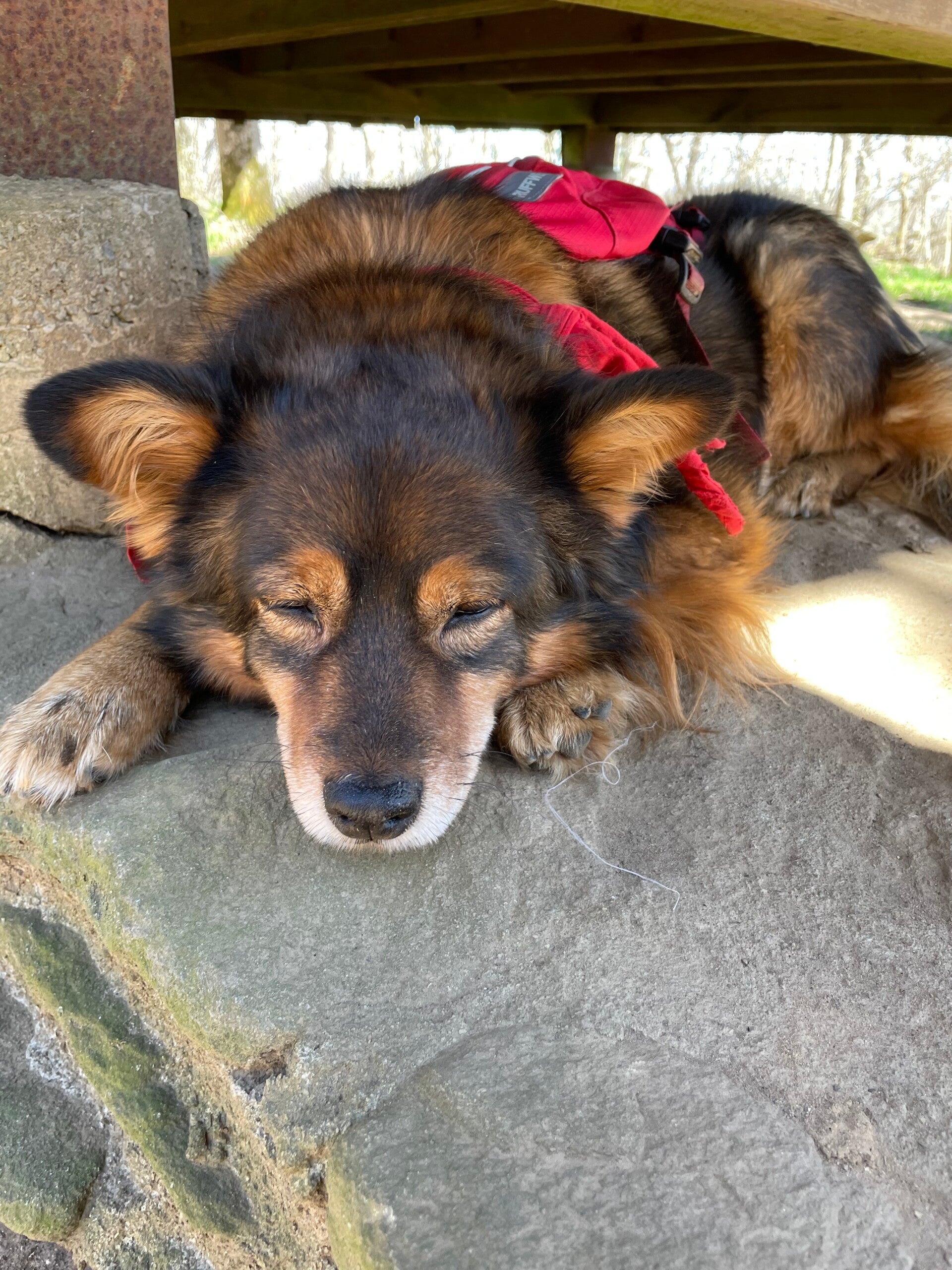 Na und dann sind wir nach einer sehr ungemütlichen Fahrt, ich muss mich zwischen die Füße meines Lieblingsmenschen quetschen, endlich da: Unsere erste Mahlzeit draußen