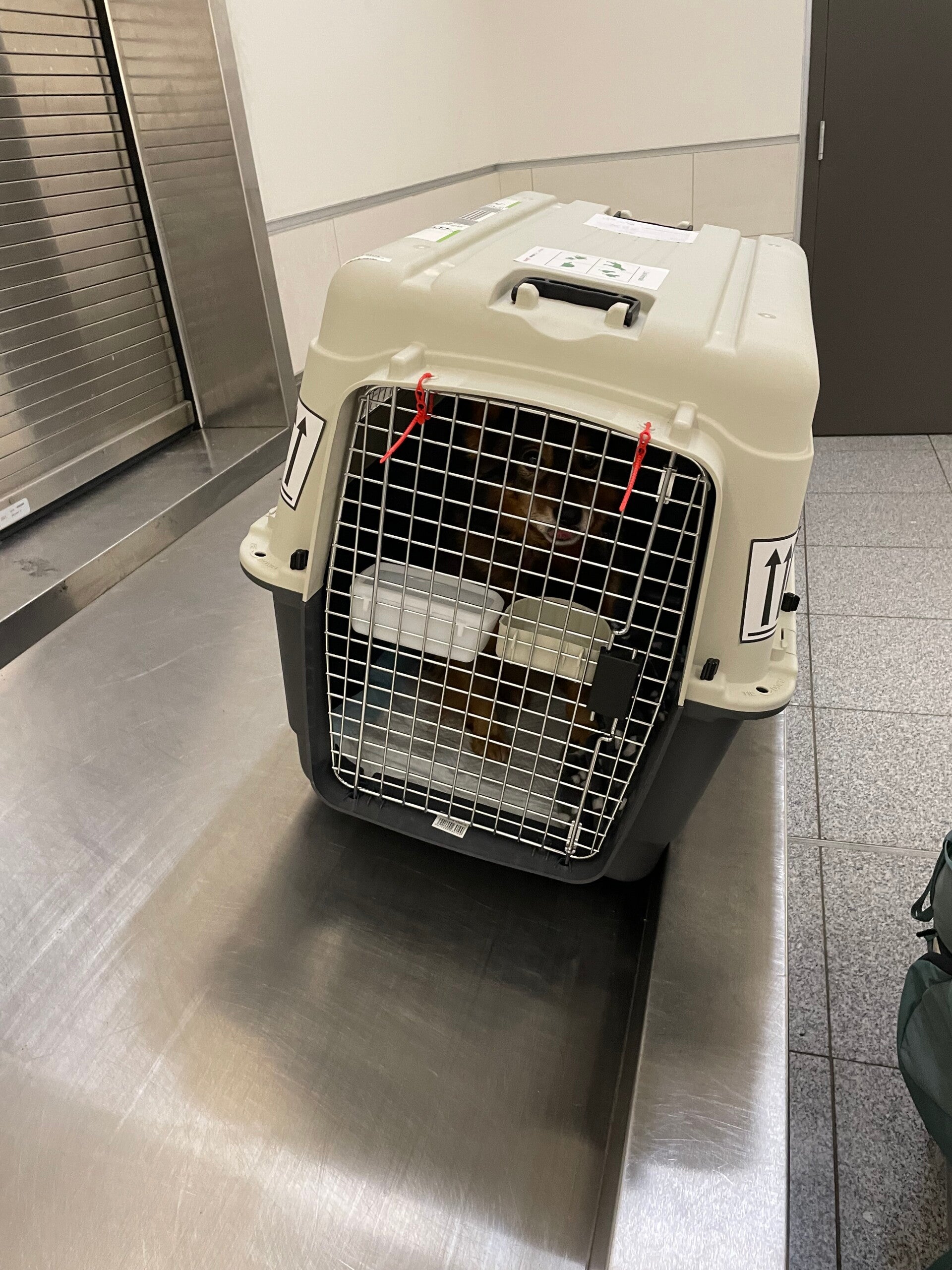 Erstmal bin ich in dieser komischen Transportbox, die so gar nicht nach zu Hause riecht und dann werde ich damit weggeschoben und in das Flugzeug verfrachtet, was uns dann nach Amerika fliegen soll.