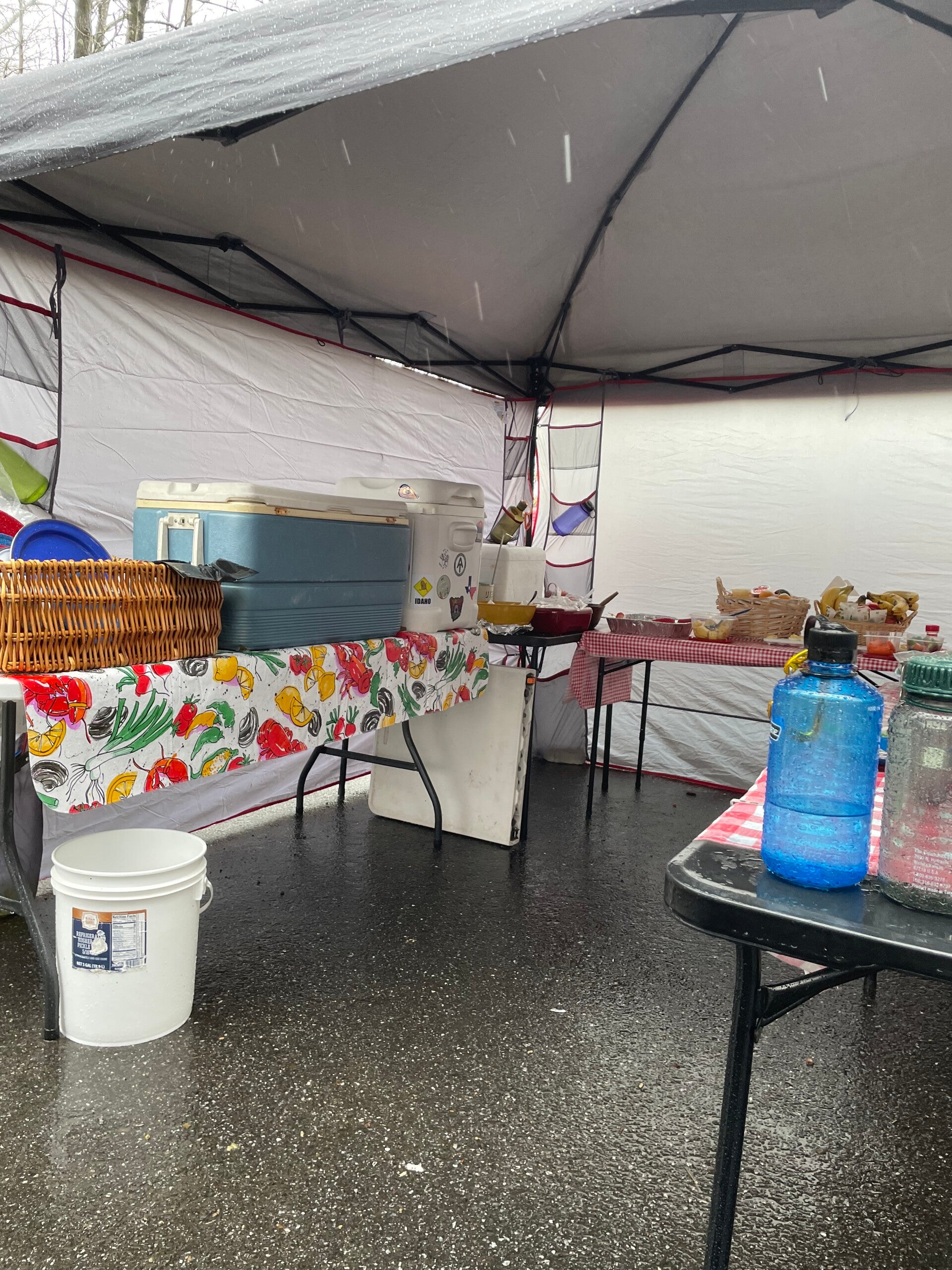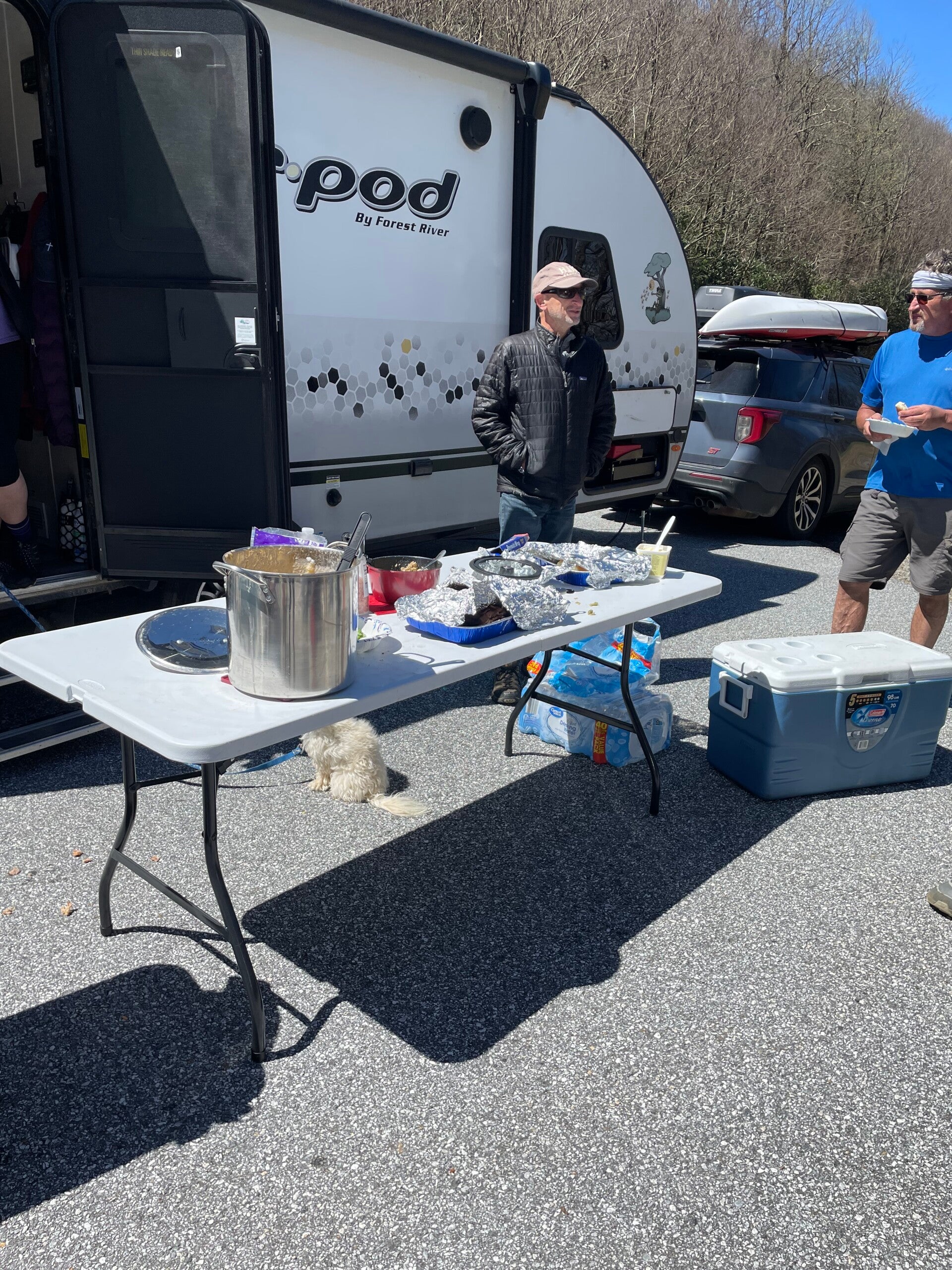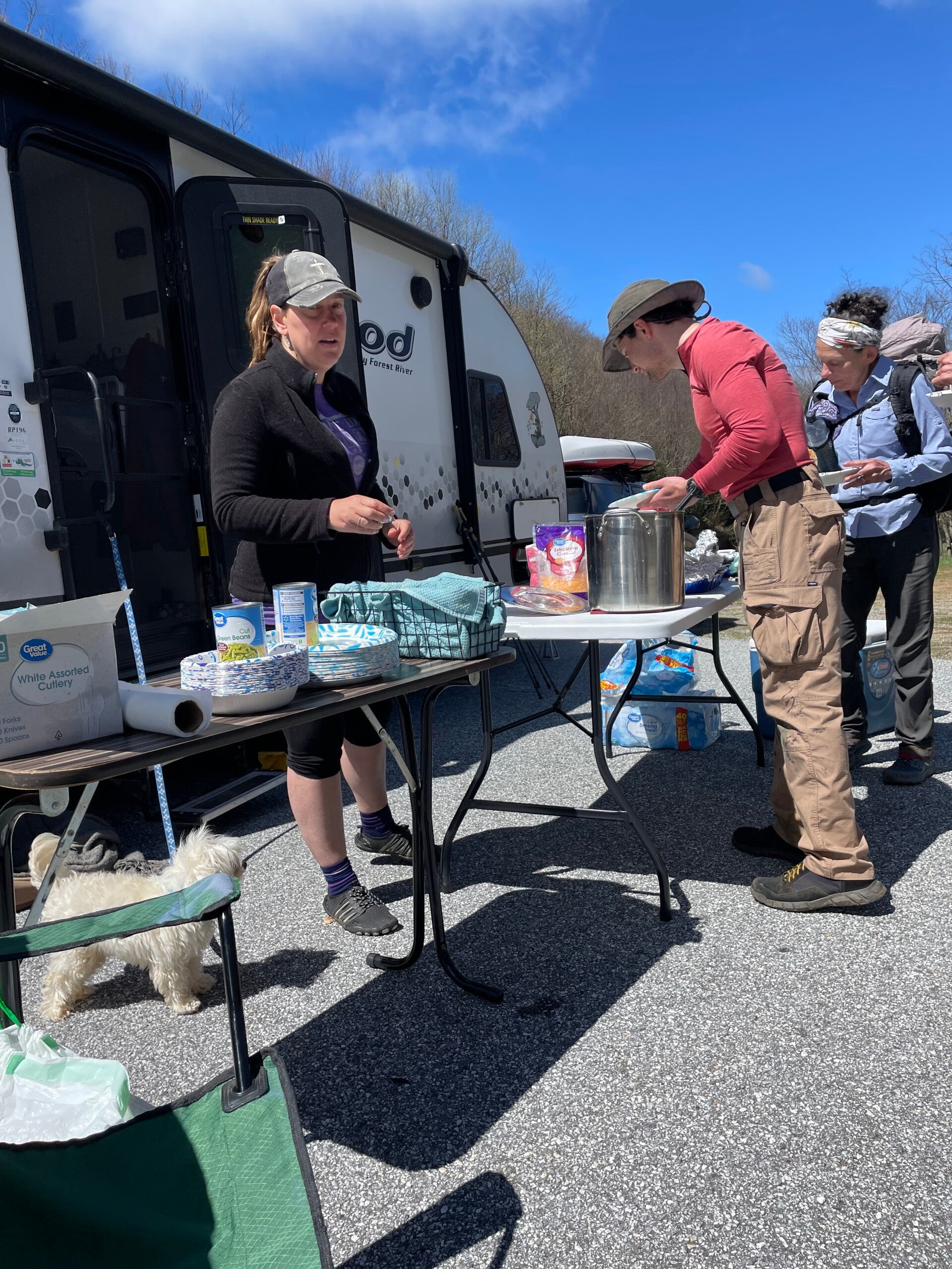 Es ist nicht wasserdicht und ich weiß auch nicht mehr wie lange wir laufen, es geht über Stunden und kein Platz zum Unterstellen. Bilder gibt es kaum von diesem fürchterlichen Tag, da wir keine Unterwasserkamera dabei haben, aber der Tag bleibt mir auch ohne Fotos in Erinnerung. Meine Pfoten sind schon ganz aufgeweicht, als wir einen Parkplatz erreichen, auf dem wir unseren ersten Trail Magic haben. Da stehen zwei Pavillons und nette Zweibeiner winken uns herüber. Wir solten doch Platz nehmen, mein Lieblingsmensch bekommt einen warmen Schlafsack zum wärmen und einen heissen Kakao. Danach gibt es Suppe.