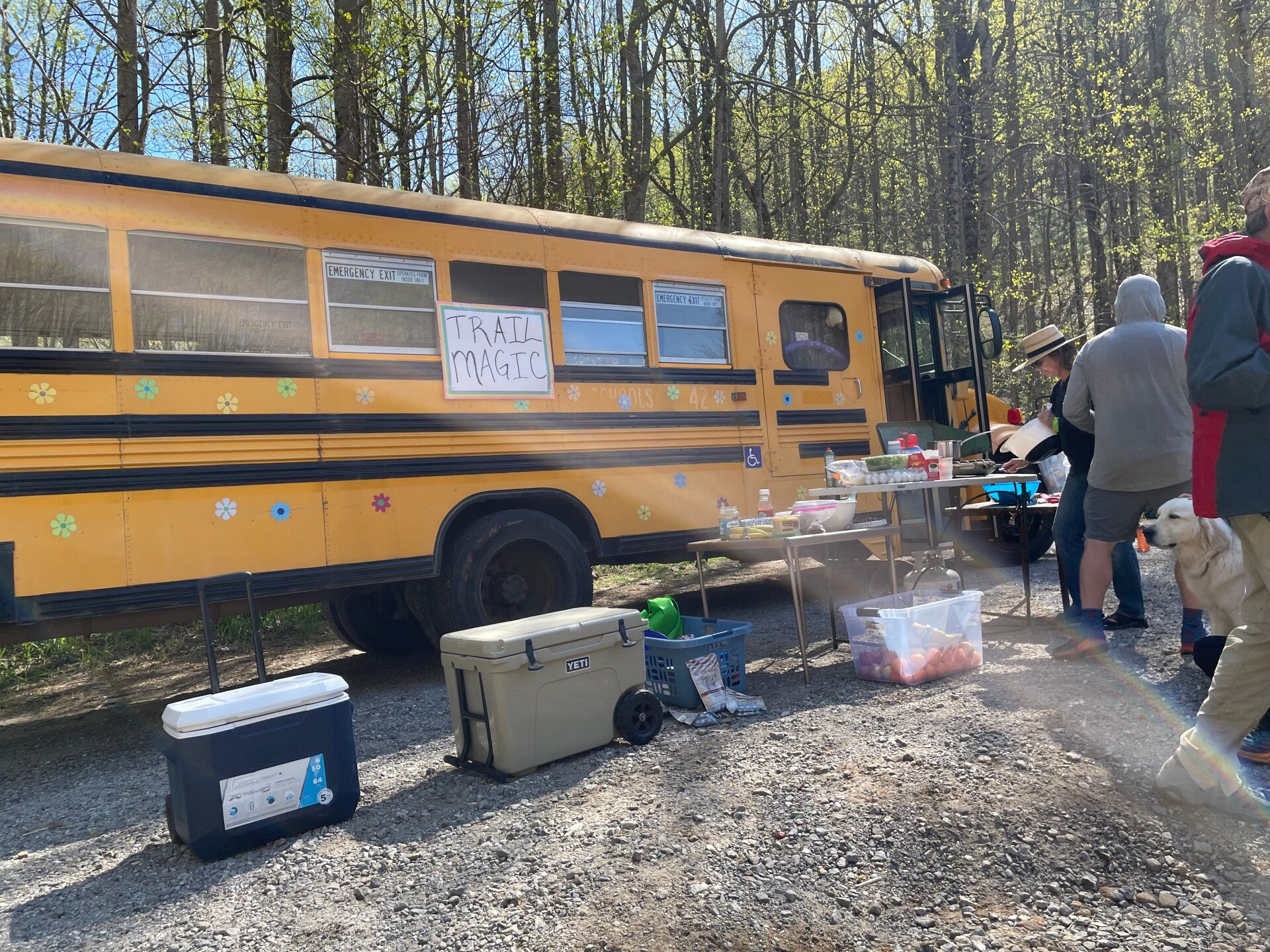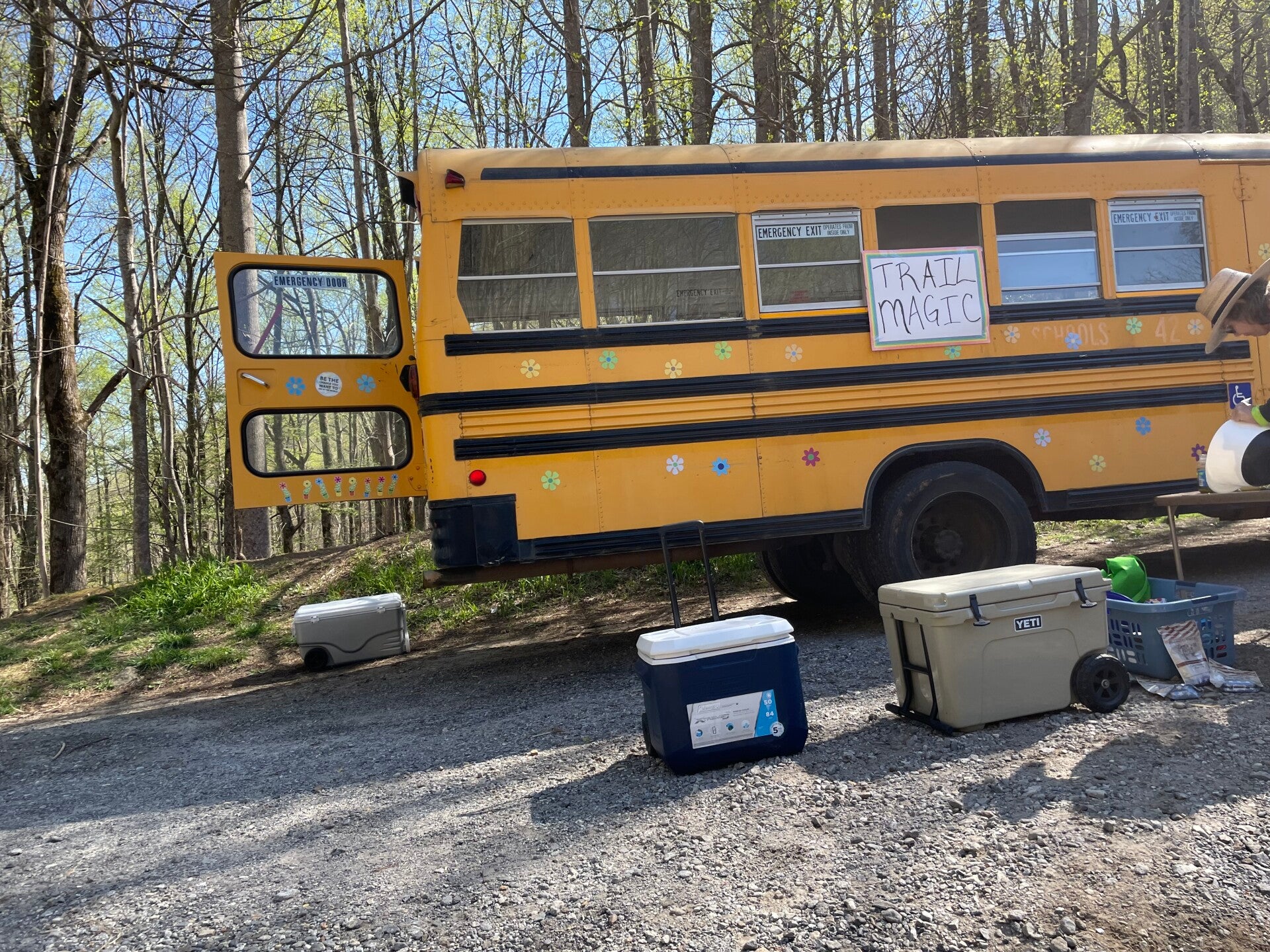 In den nächsten beiden Tagen haben wir super Sonnenwetter und mein Lieblingsmensch wird auch immer fitter beim Laufen. Das liegt vielleicht auch am Gewicht ihres Rucksackes, der immer leichter wird, da sich auch die darin befindlichen Nahrungsmittel immer weniger werden. Sie zählt schon ab, was sie essen kann, damit es reicht. So taucht doch tatsächlich auch schon der dritte Trail Magic auf, in einem umgebauten, ehemaligen Schulbus. Ich staune nicht schlecht, was mein Lieblingsmensch alles in sich hineinstopft, als ob es demnächst nichts mehr zu essen gäbe. Naja, irgendwie ist es ja auch so.