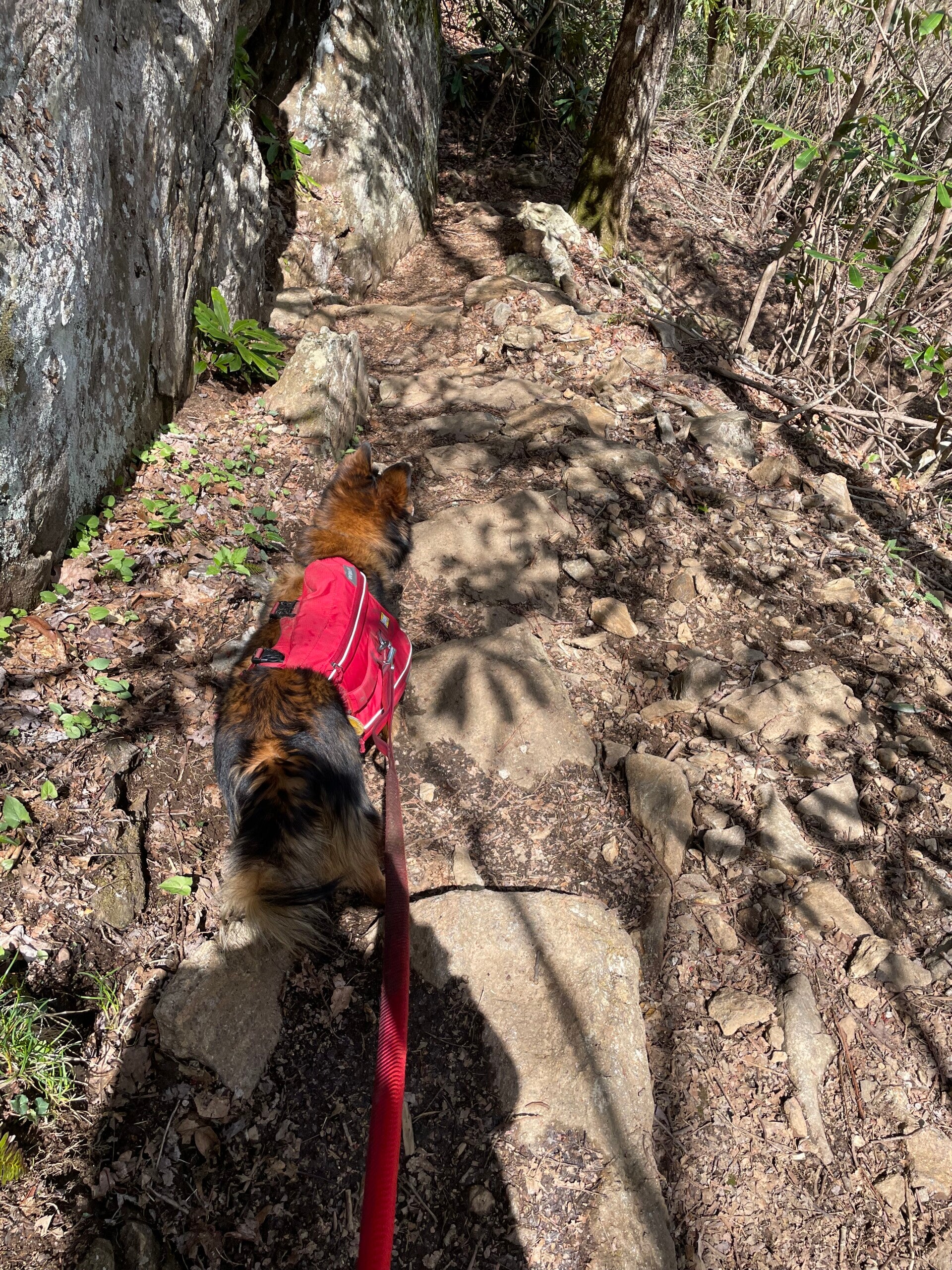 Es sind ja nun nicht die Feldwege, die ich von zu Hause kenne, abgesehen davon, dass es hier bergig ist und es ständig zwischen hoch und runter wechselt, es sind die Pfade selbst, die nicht ganz ohne sind. Es geht über Baumwurzeln, riesigen Felsbrocken und Bächen hinweg. Ich natürlich ganz elegant und leichtpfotig, während mein Lieblingsmensch...... Naja reden wir mal lieber nicht drüber!