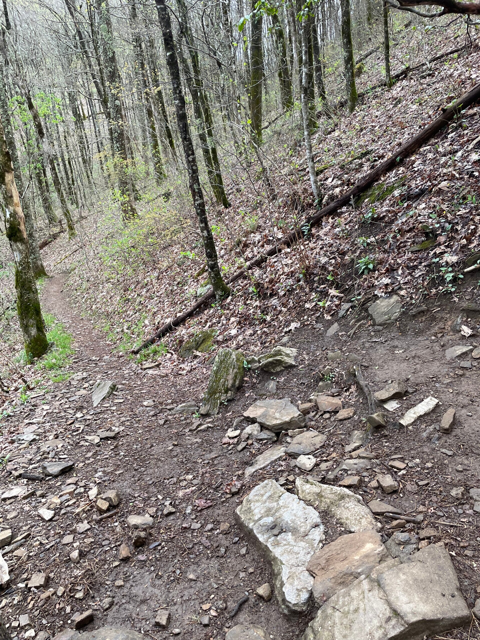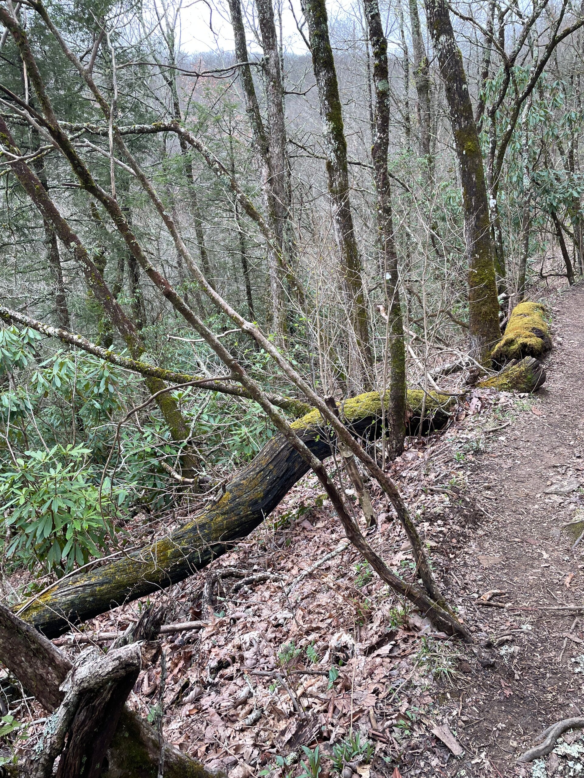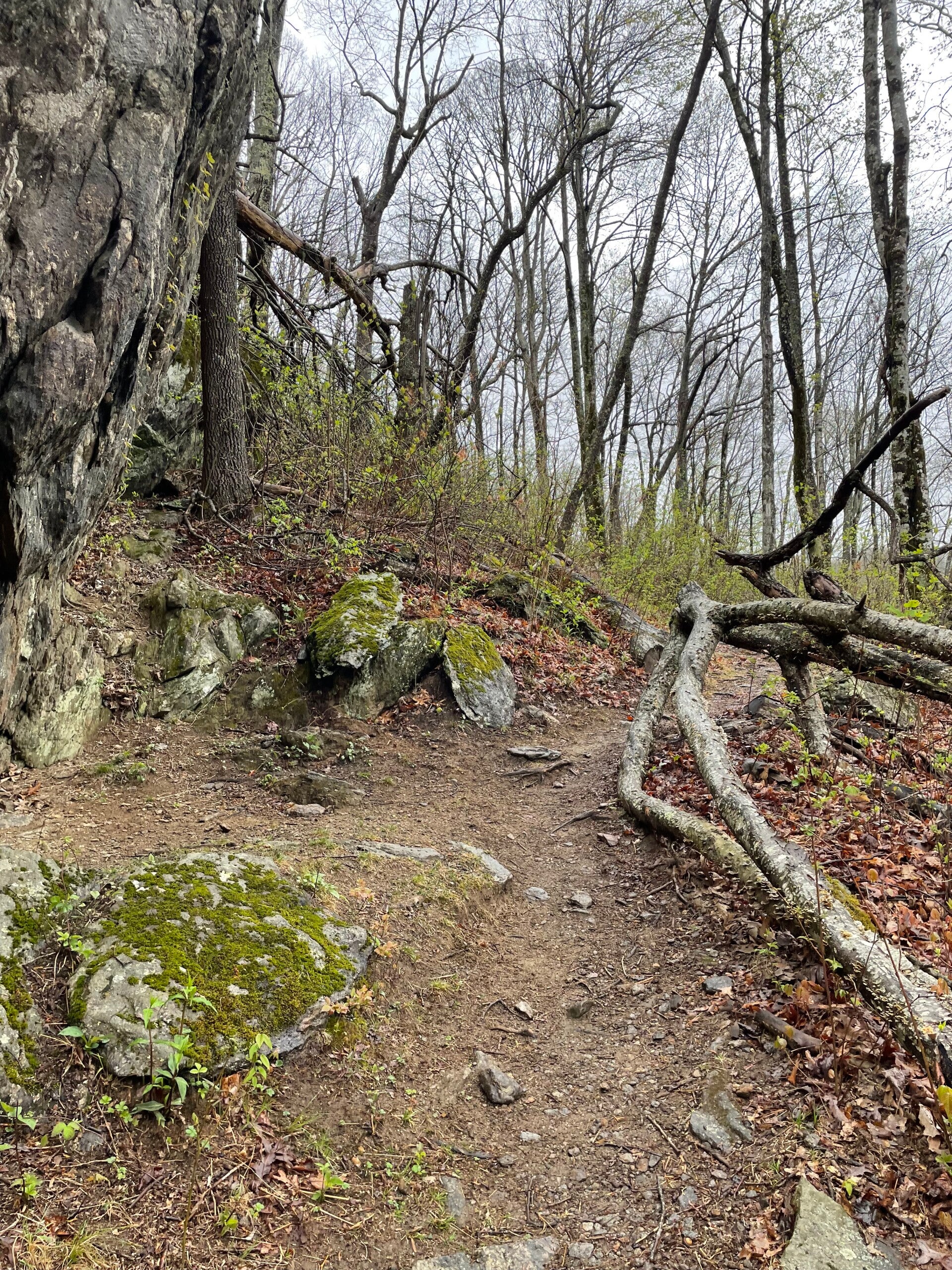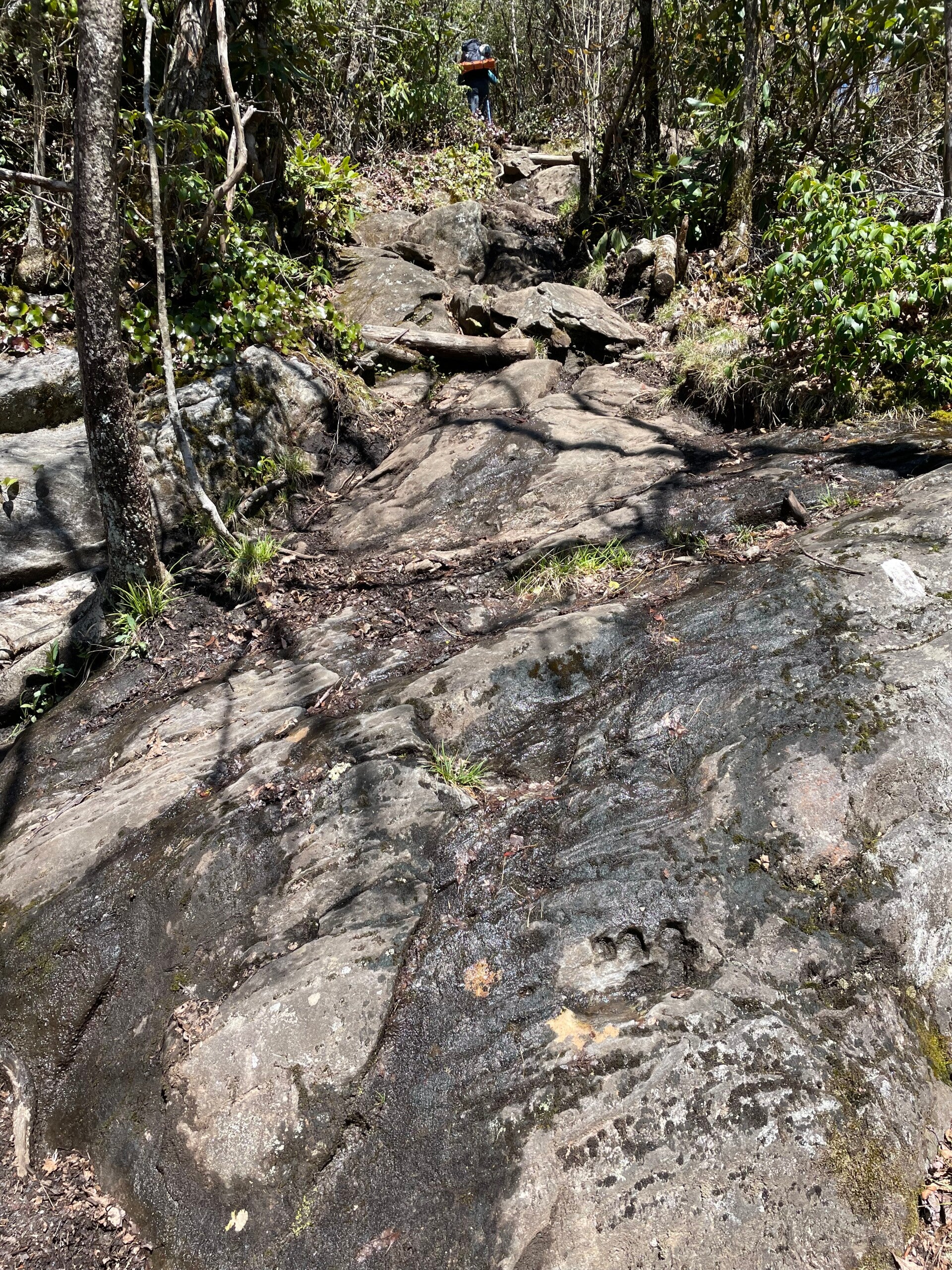 Es regnet fürchterlich in dieser Nacht mit Gewitter aber zum Glück ohne Schwarzbär. Am nächsten Morgen geht es dann bei Nieselregen weiter. Wir wollen gerade los, als an unserem Platz ein uns bekannter zweibeiniger Hiker vorbeikommt und meinem Lieblingsmenschen die Bärenwarnung mitteilt. Im Carter Gap Shelter soll sich ein Bär herumtreiben und wir sollen diesen Shelter meiden. Ok soweit wollen wir an diesem Tag eh nicht laufen, aber wie weit läuft ein Bär in der Nacht? Also ich schlafe nachts und mit Bären kenne ich mich nicht aus.