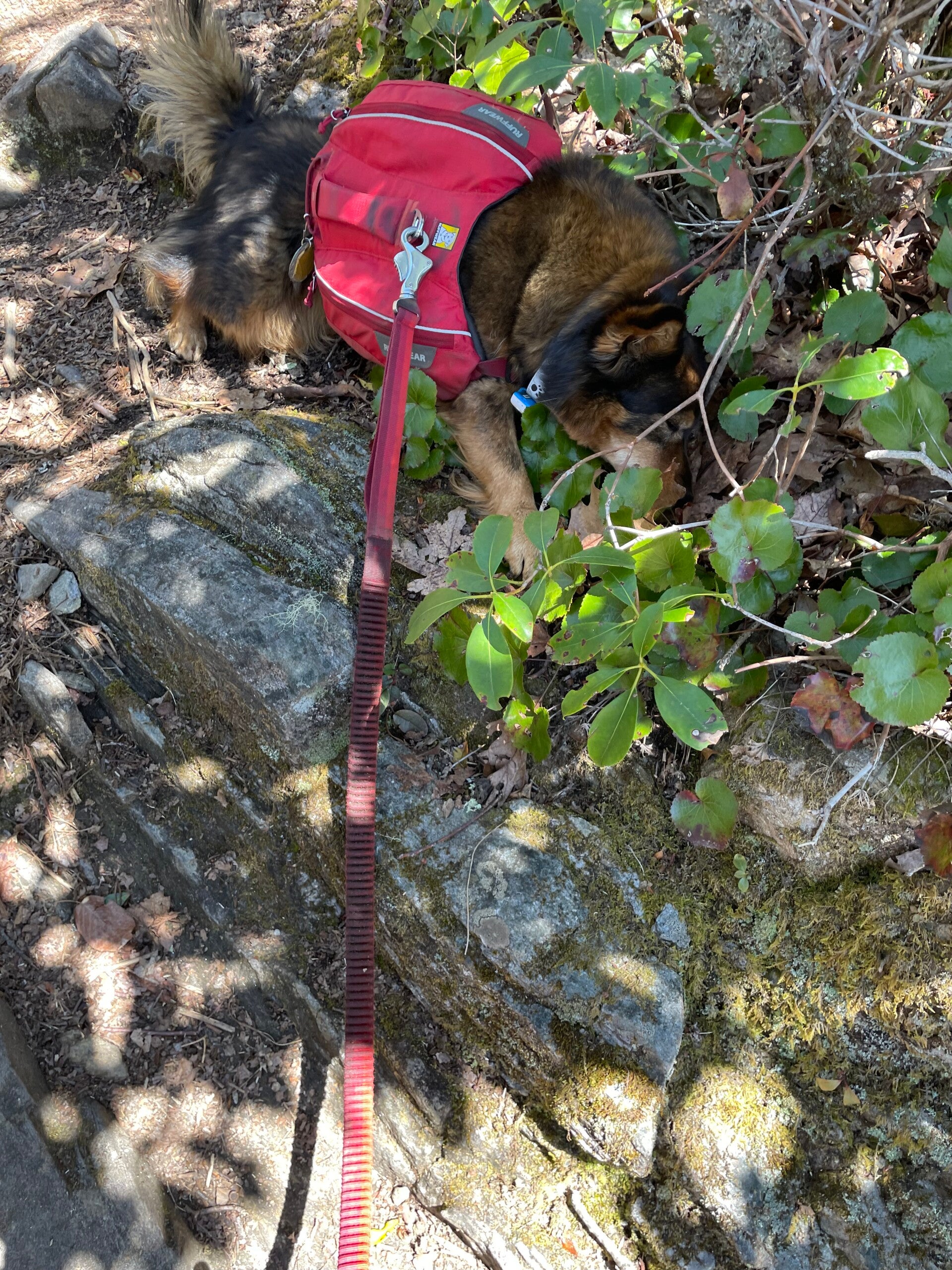 Nach dem Schrecken der Nacht klettern wir am nächsten Tag bei schönsten Wetter auf einen hohen Berg . Ich natürlich vorne weg und mein Lieblingsmensch keuchend hinterher. Ok, sie hat ja noch den Rucksack zu tragen, aber auch ich trage mein Gepäck und das sind auch 1,2 kg. Und ich stelle mich trotzdem geschickter an. Aber ich bin halt auch ein Hund und einfach besser!