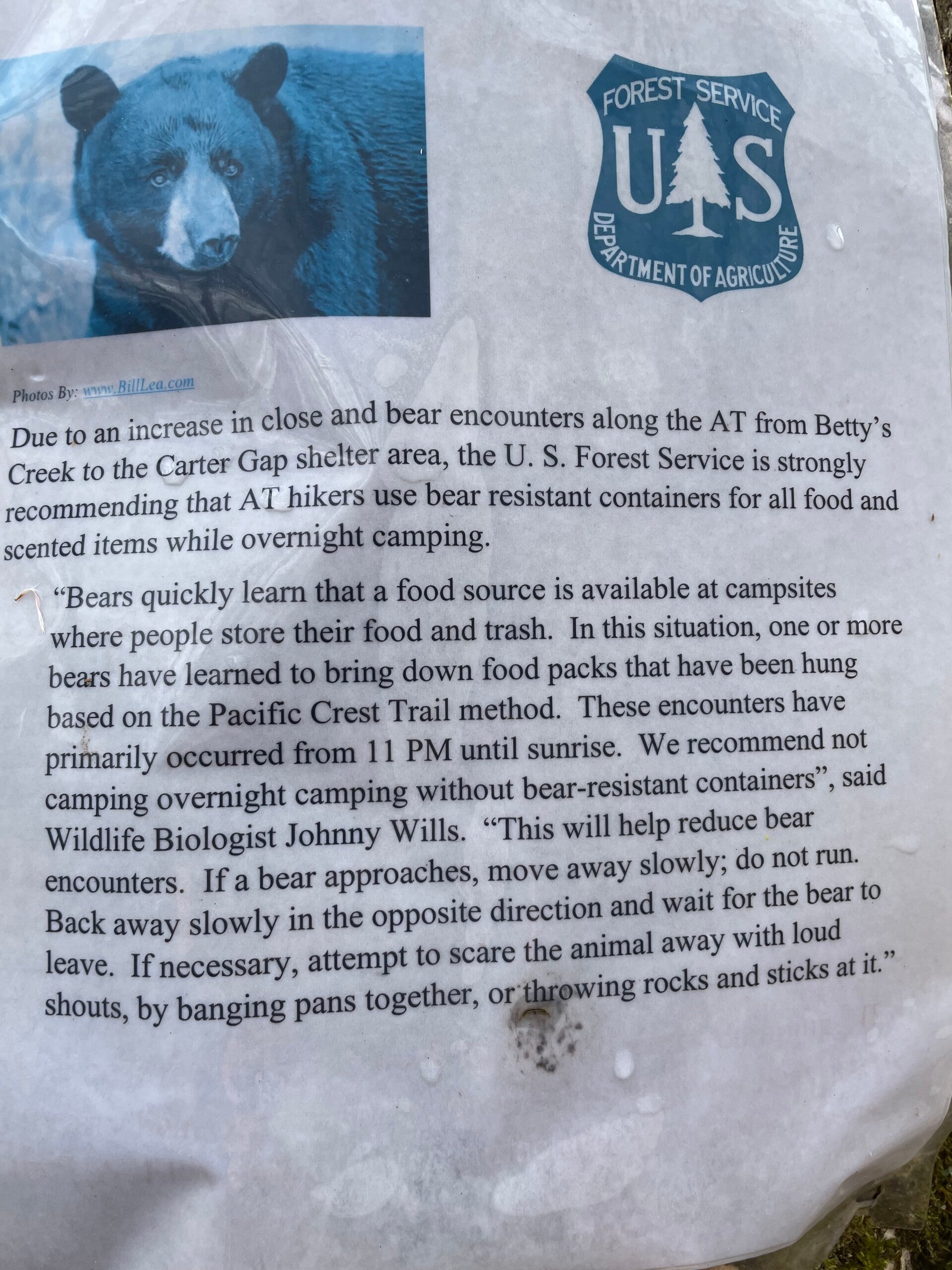 Wir laufen weiter zum nächsten Zeltplatz, zum Betty Creek Gap. Ist da nicht was? Stimmt, zwischen dem Platz und dem anderen Shelter wandert der Bär umher!