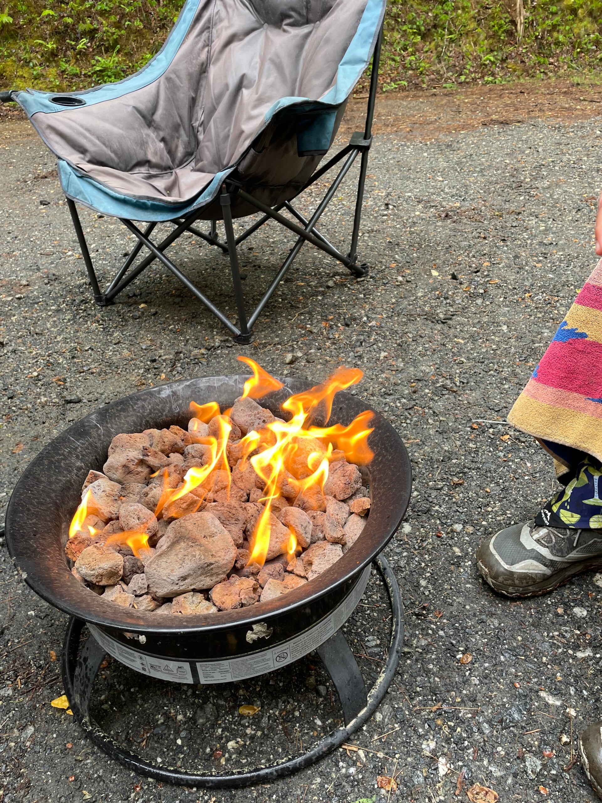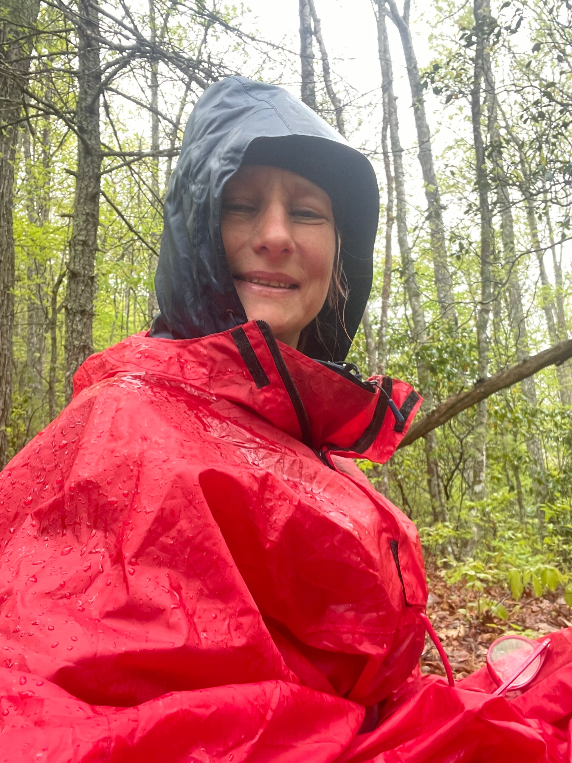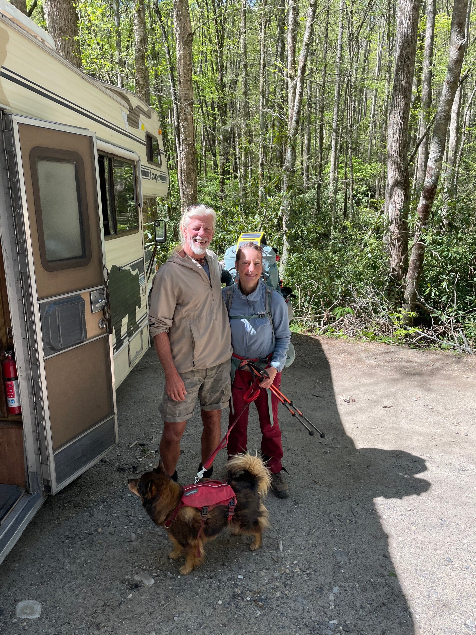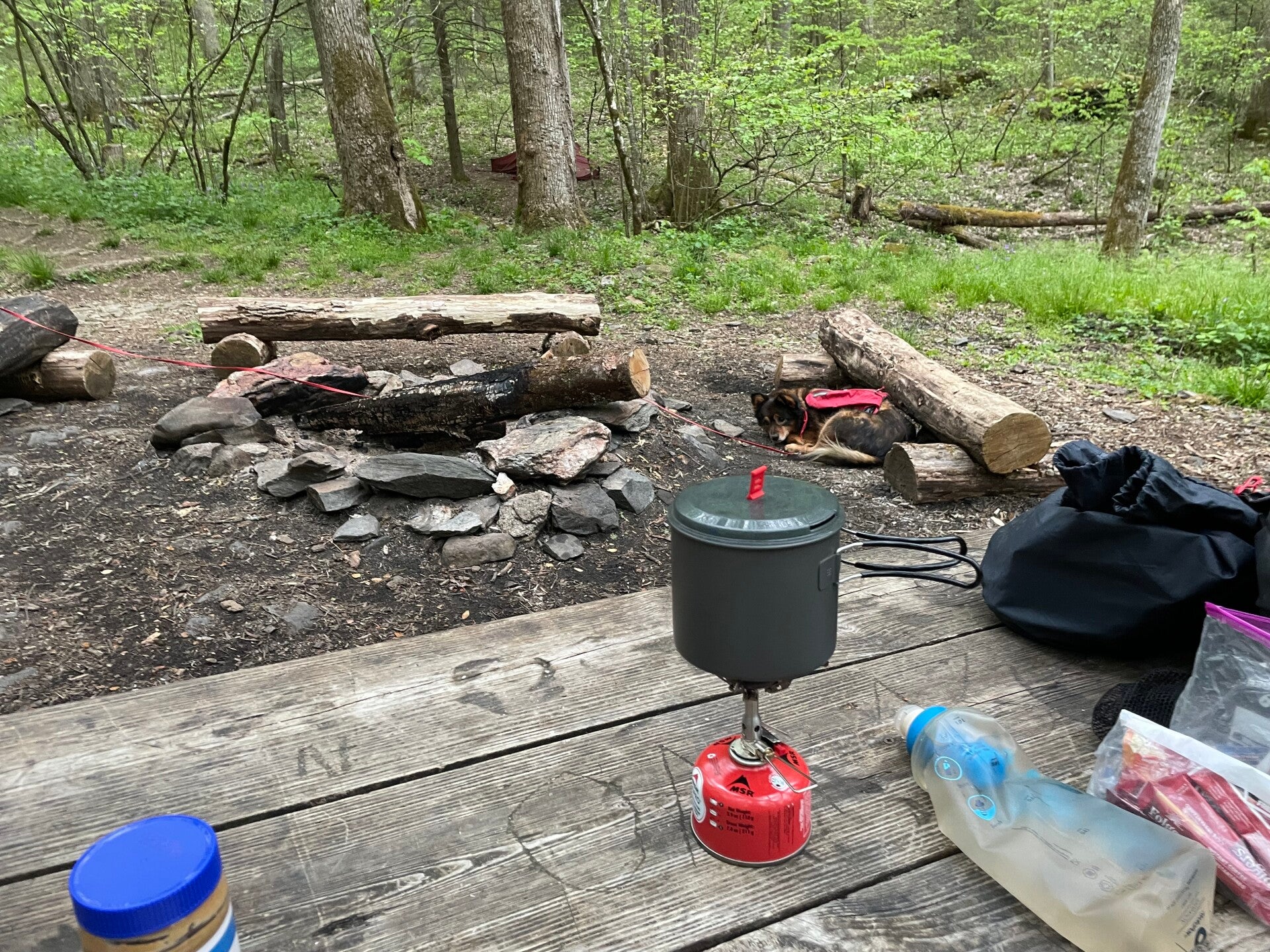 Die nächsten beiden Tage regnet es nur, wir gehen nass schlafen und laufen nass weiter. Sehr unangenehm. Aber wie das hier oft so ist taucht plötzlich ein Trail Magic auf und alles wird besser. So auch auf unserem Weg, 10 km vor Hot Springs. Nette Zweibeiner, die uns mit Snacks und Getränken versorgen und eine Feuerschale zum Wärmen dabei haben.Und nicht nur das, sie bieten auch an, das Gepäck zum Hostel zu fahren, denn ohne läuft es sich doppelt so schnell. Ich würde auch gerne mitfahren, aber das will mein Lieblingsmensch nicht. Fremden das Gepäck anvertrauen ist das eine, aber auch noch den Hund? Nachher ist beides weg! Also musste ich leider auch laufen und das bei dem Wetter!