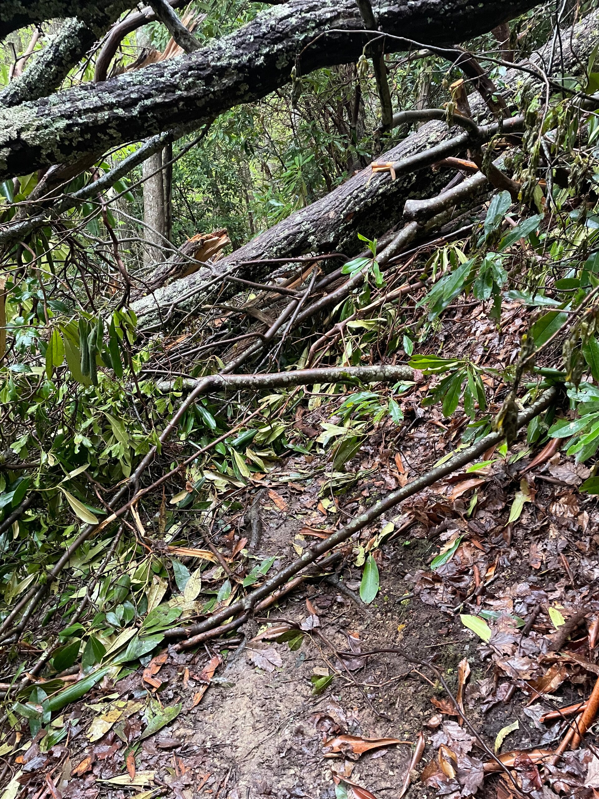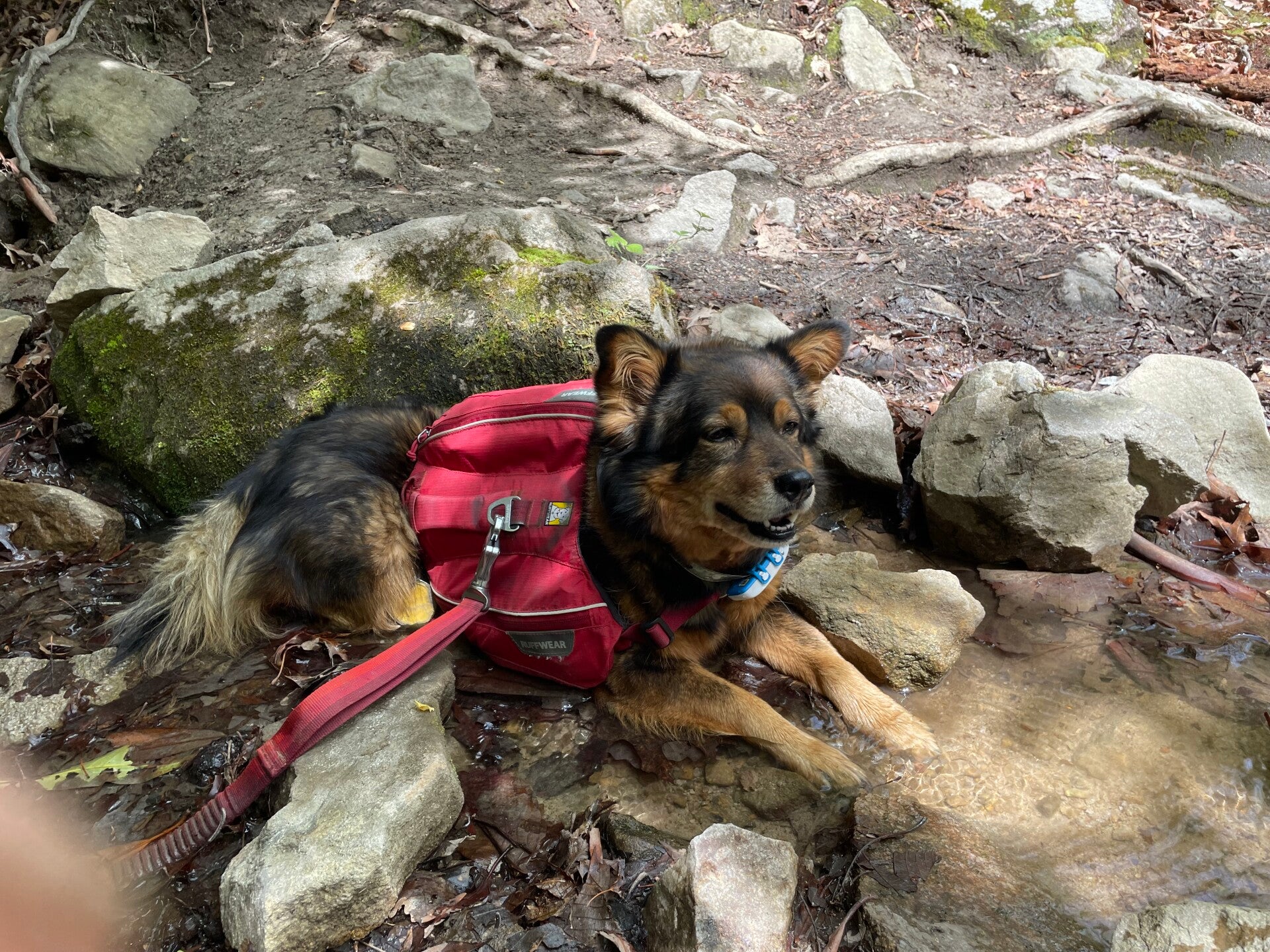 Einmal gibt es Bananen am Wegesrand, ein anderes Mal ein Eis und für mich leckeres Hähnchenfleisch von einem Zweibeiner, der mit seinem Campingbus den Trail abfährt. An einem Haus mitten im Wald gibt es frisches Wasser, selbstgemachte Erdnusskekse und für mich Leckerlies. Irgendwann steht eine Kühlbox an Wegesrand mit Eiern, Obst, Chips und Keksen. Der nette Typ mit dem Eis kommt uns entgegen und gibt meinem Lieblingsmenschen Oreokekse, hatte diesmal leider kein Hähnchen dabei. Das gibt es dann aber wieder ein anderes Mal. Das hilft dann schon, die anstrengenden Pfade zu überwinden.