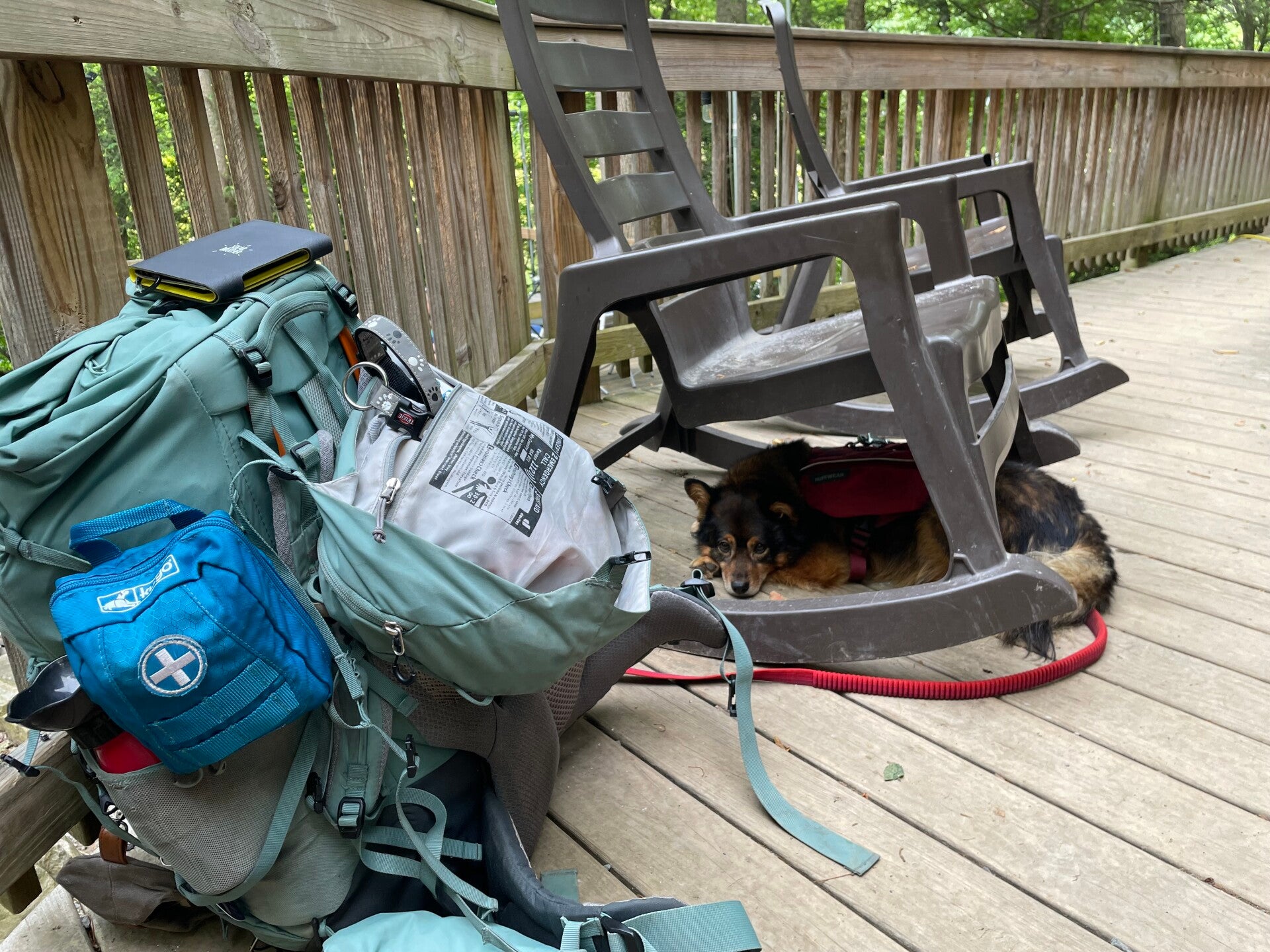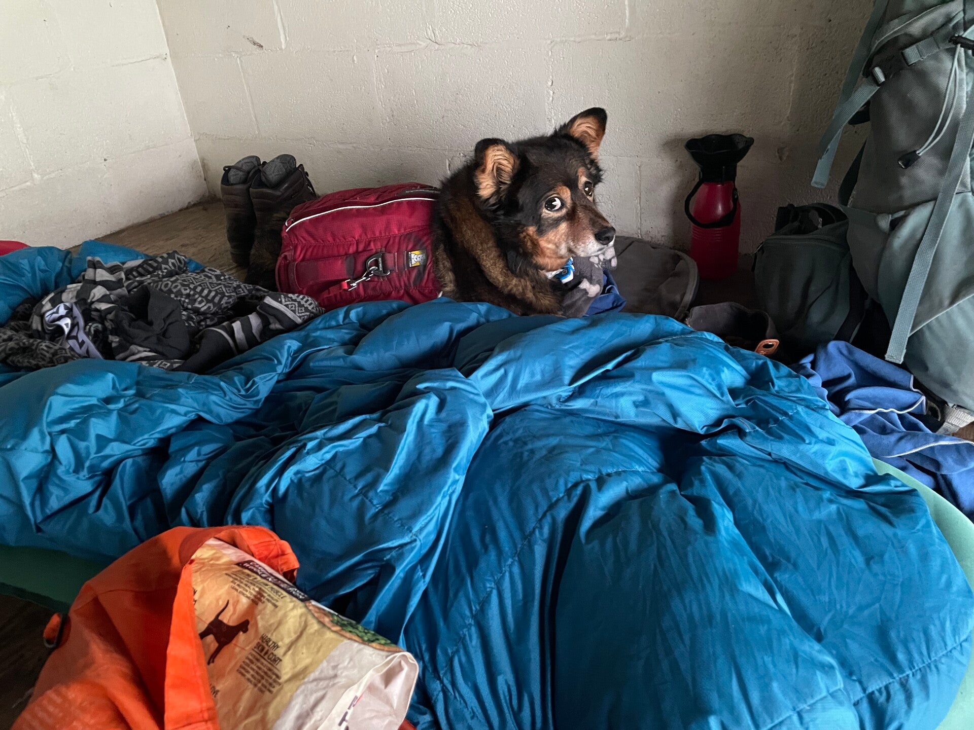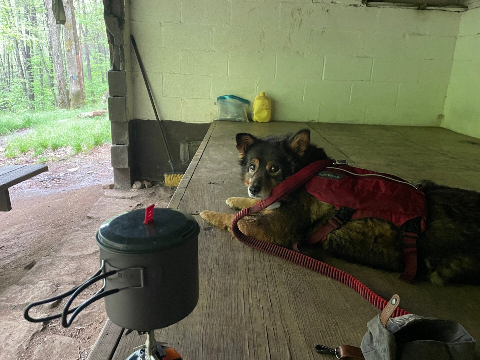 Dann fängt es aber plötzlich an zu regnen, kurz bevor wir am nächsten Shelter vorbeikommen. Mein Lieblingsmensch renntlos und ich muss zwangsweise ja mit und kaum erreichen wir die überdachte Unterkunft , geht der Regen richtig los. So viel Wasser und es hört gar nicht mehr auf. Wir bleiben also da und verbringen auch die Nacht dort mit drei anderen zweibeinigen Hikern.