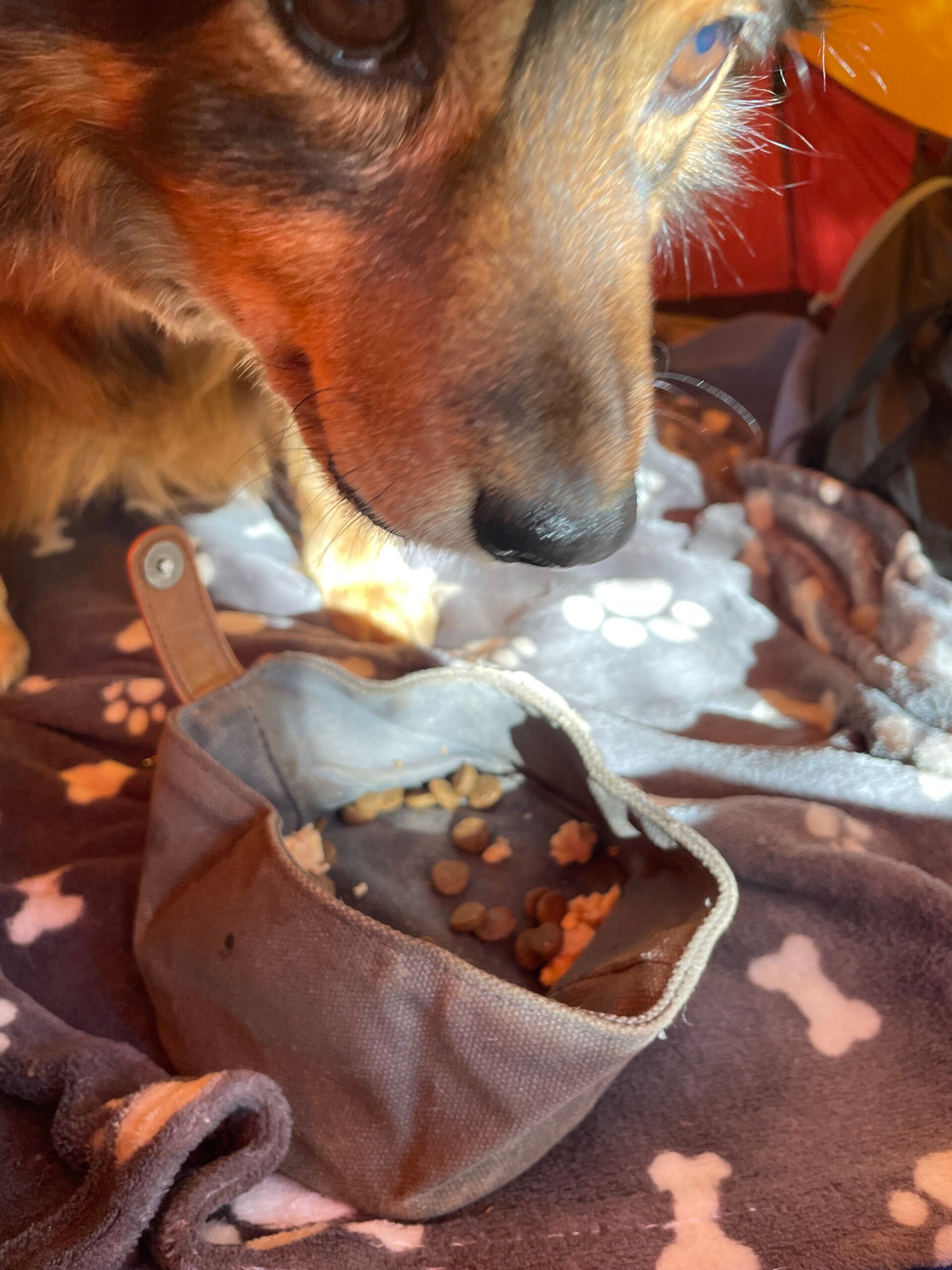 Unterwegs gibt es kleine Pausen mit Leckerlies für mich, Schokolade für meinen Lieblingsmenschen und Wrap mit Erdnussbutter für uns beide.