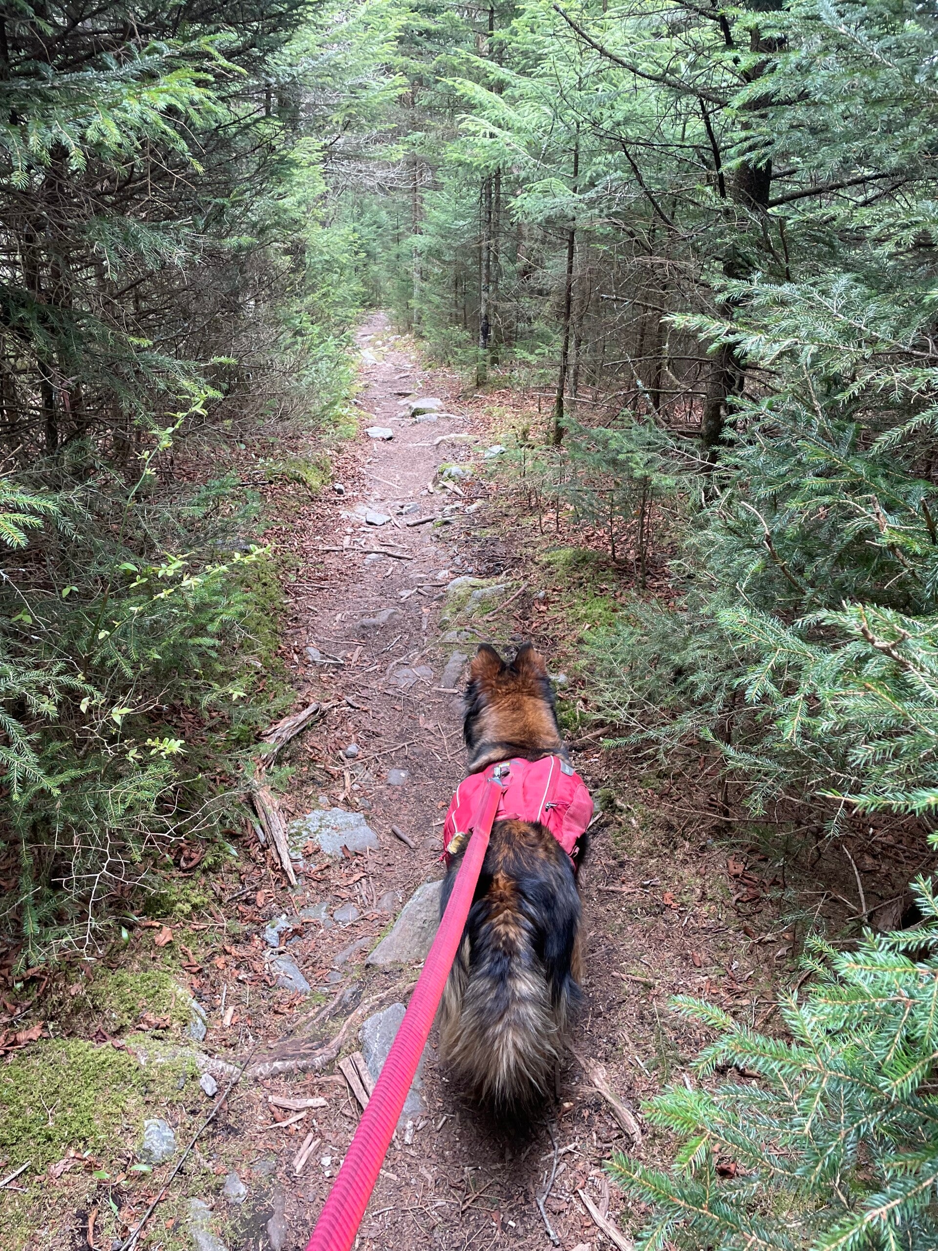 Wir wollen eigentlich noch 8 km weiterlaufen, das Wetter ist gut, bewölkt, nicht zu warm für mein Fell und der Weg ist angenehm, kaum Wurzeln und Steine über die mein Lieblingsmensch sonst gestolpert wäre.