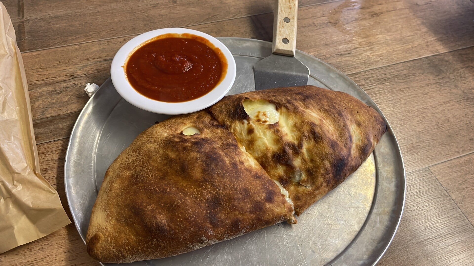 Gleich gegenüber ist eine Pizzeria und ein Lebensmittelladen.